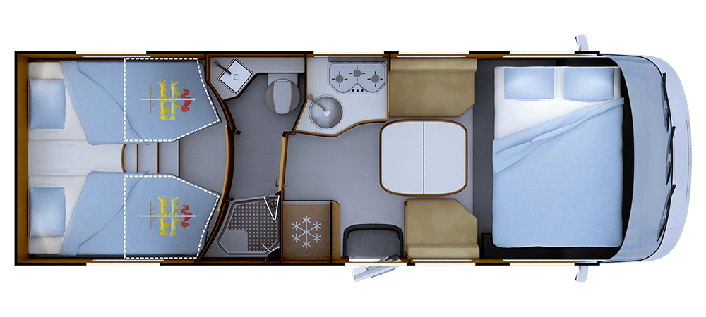 * 2 With option of no cab bed **Seats with seatbelts; for registered seats, please refer to the technical manual. ***Truma Combi 6 CP PLUS